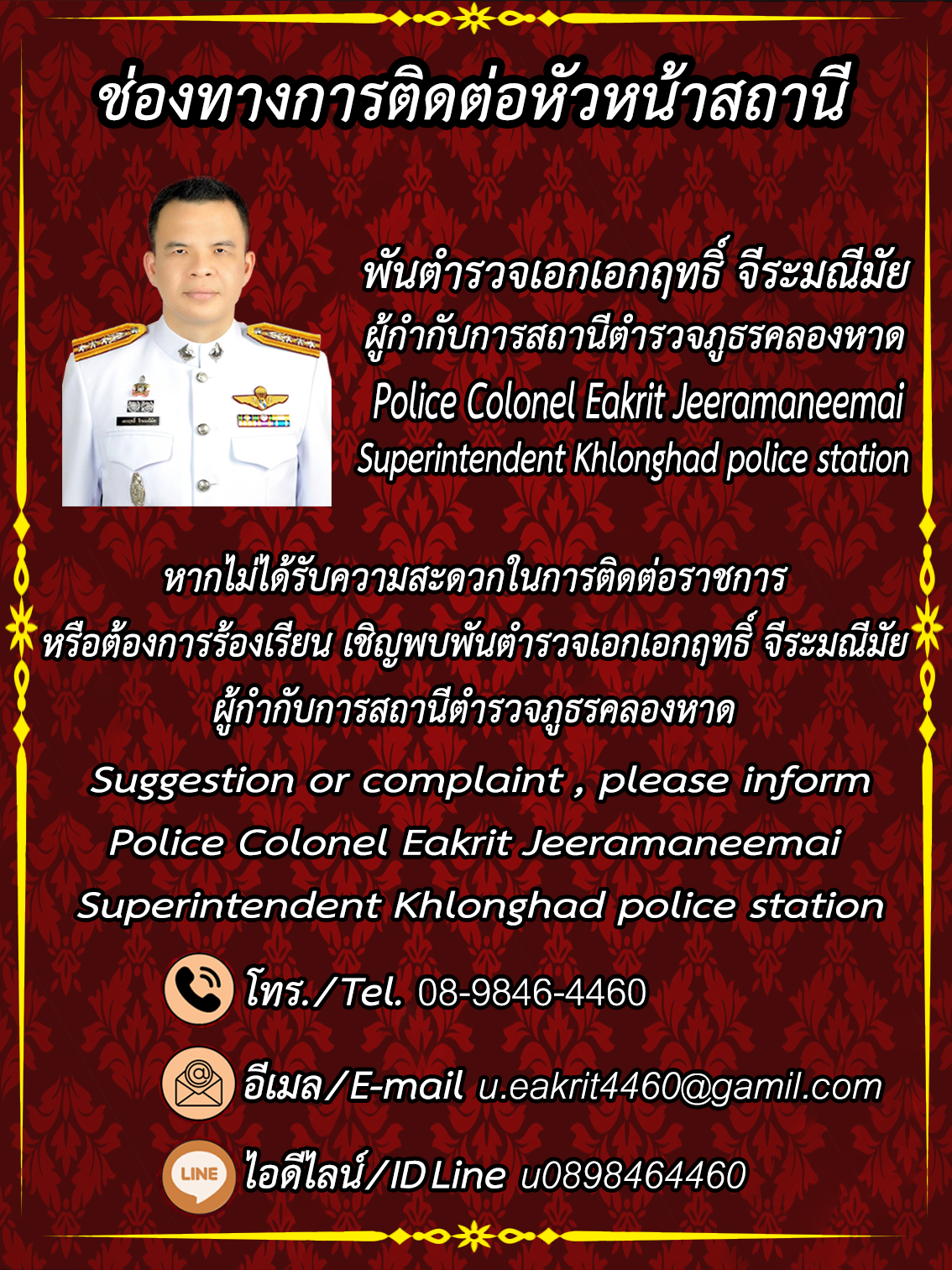 ” เป็นตำรวจมืออาชีพ ปฏิบัติหน้าที่ด้วยความซื่อสัตย์ สุจริตโปร่งใส เพื่อให้เกิดความผาสุขแก่ประชาชน“