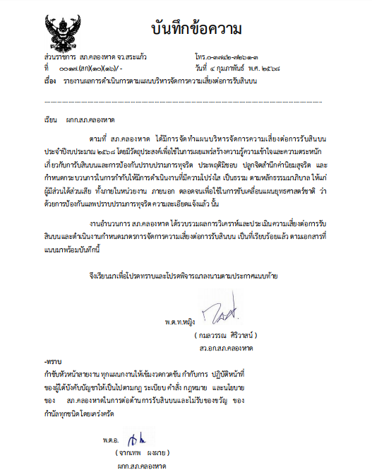 O21 การรายงานผลการดำเนินการเพื่อจัดการความเสี่ยงต่อการรับสินบน