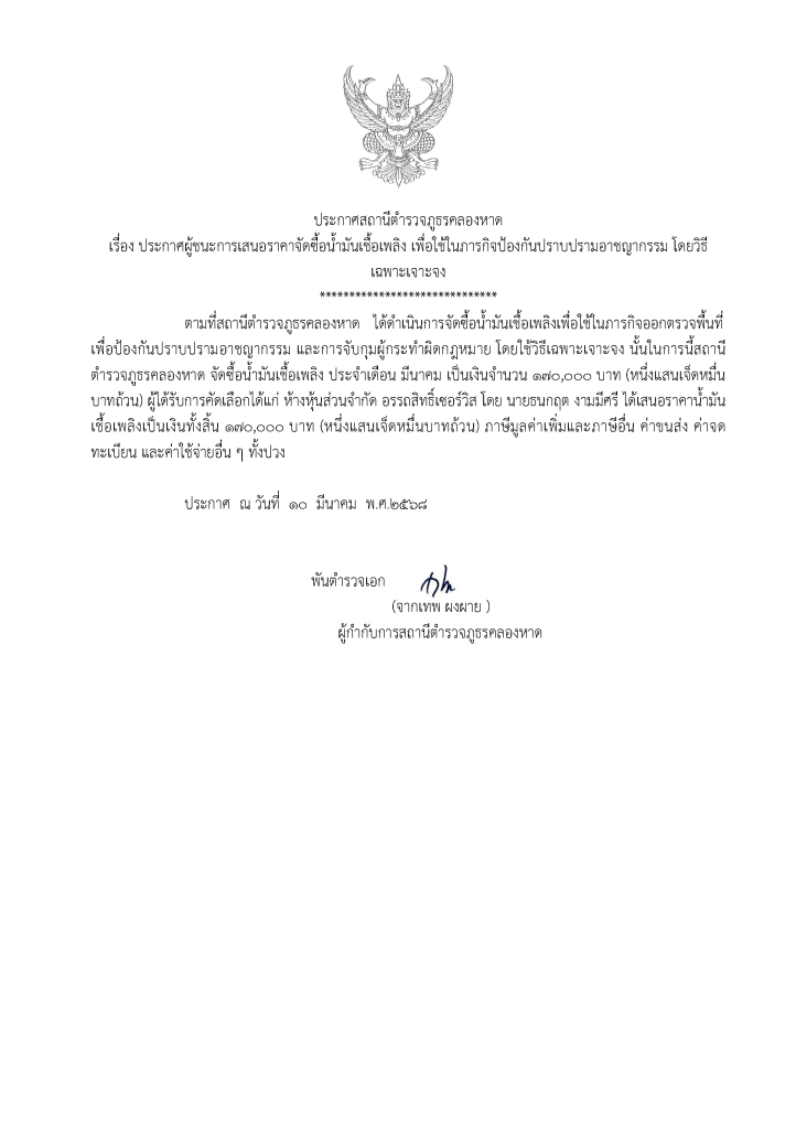ประกาศจัดซื้อจัดจ้างน้ำมัน สภ.คลองหาด มี.ค.68