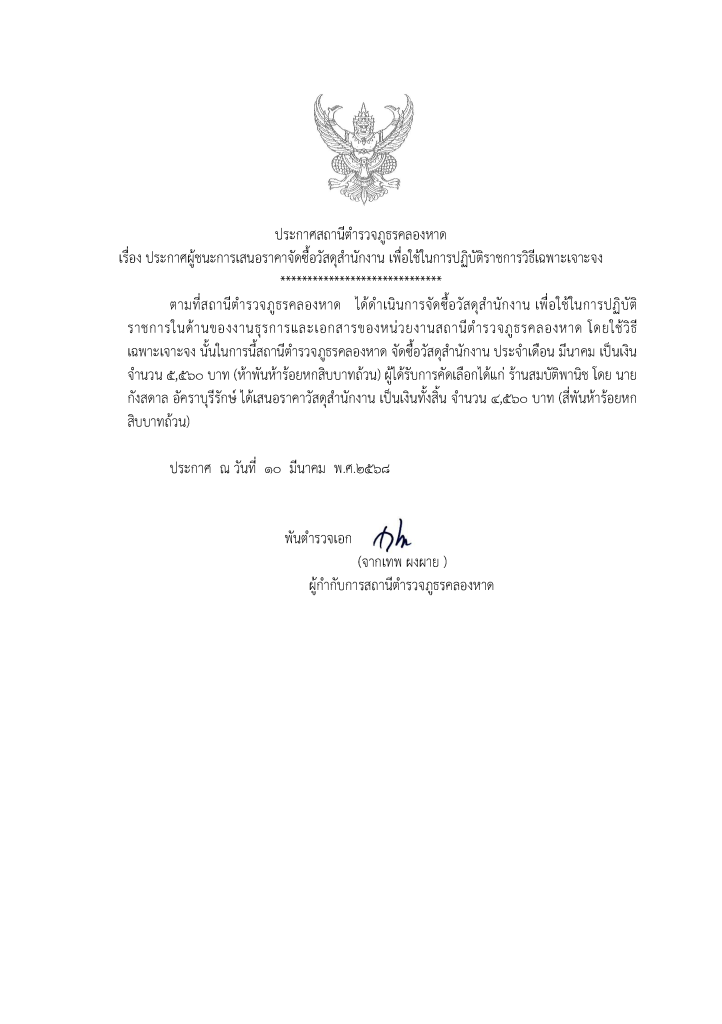 ประกาศจัดซื้อจัดจ้างวัสดุสำนักงาน สภ.คลองหาด มี.ค.68